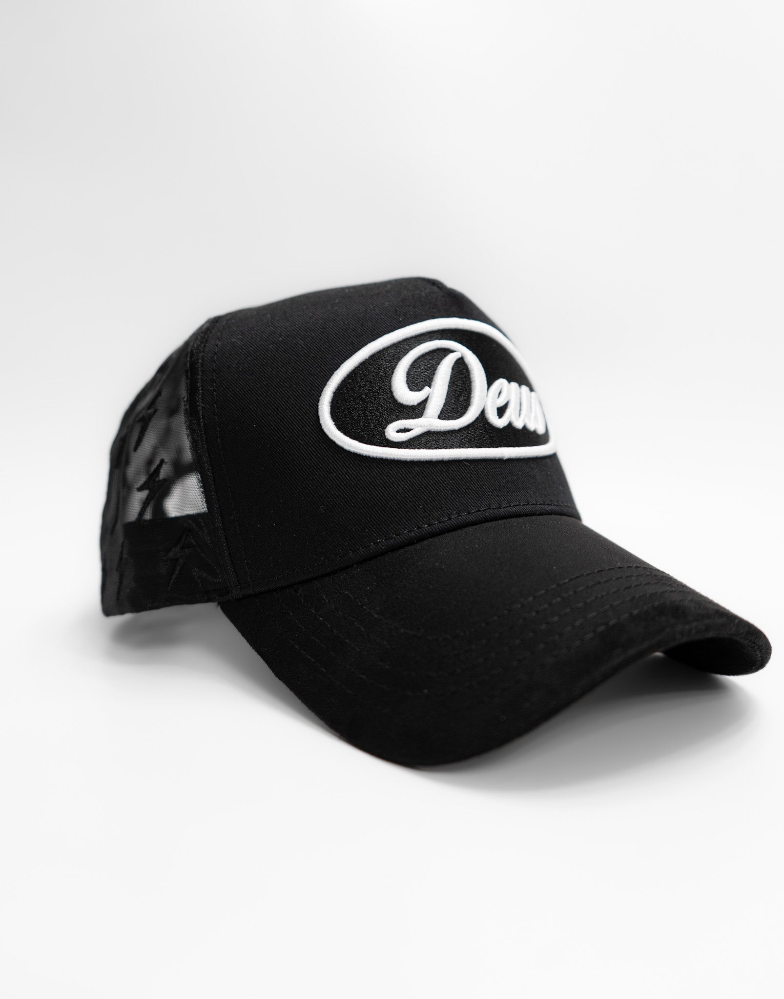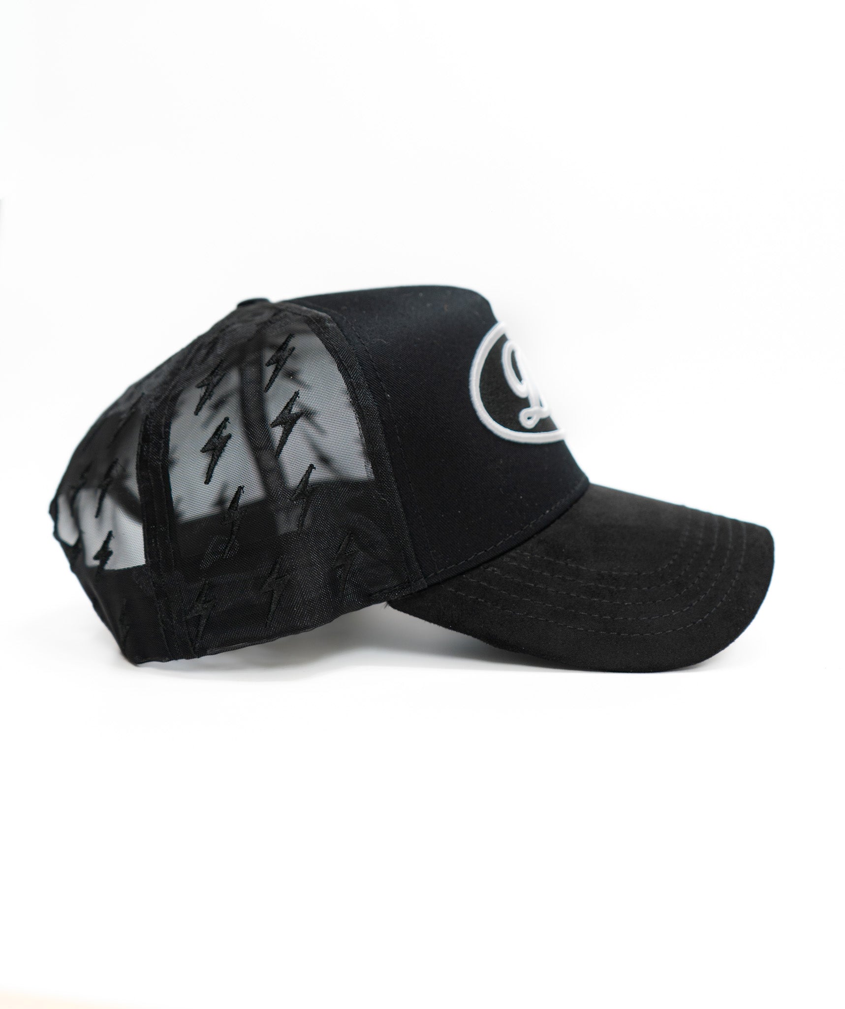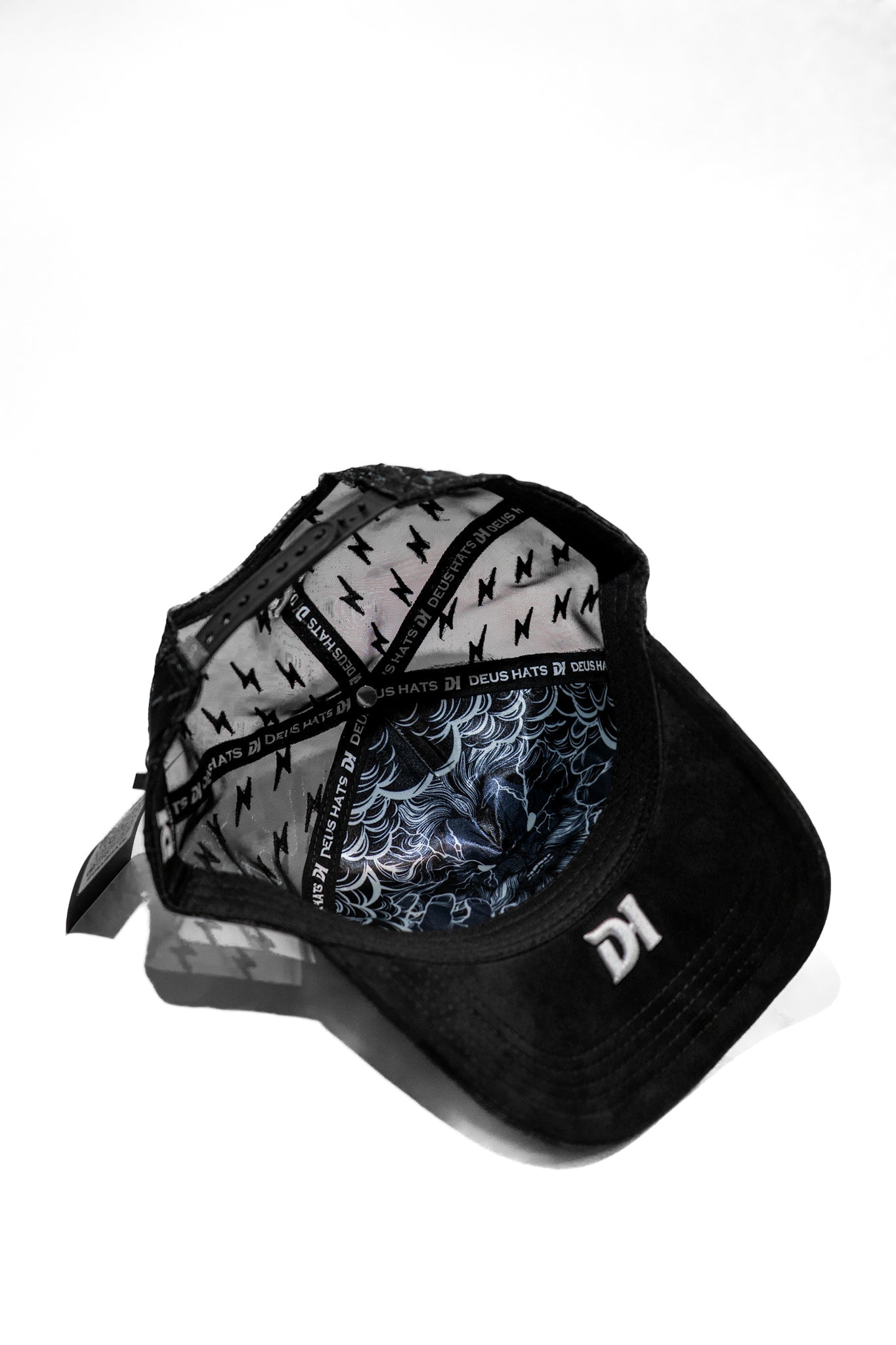 Mesh style with lightning bolts around with Zeus inside the cap and a suede brim
